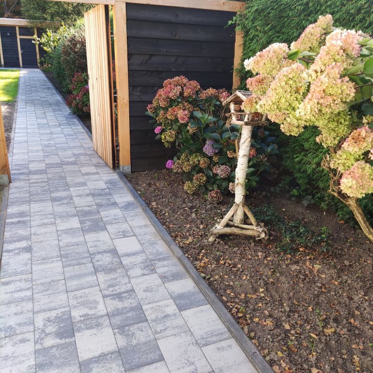 Deze steen is gemakkelijk te verwerken. Hier heb je namelijk geen speciale ondergrond voor nodig. Een geëgaliseerd zandbed is dan ook voldoende. Let op dat je voor de oprit extra versteviging nodig hebt. Voeg daarom een laag grof grind of gebroken puin aan de ondergrond toe. Dankzij de geïntegreerde afstandhouders leg je de stenen direct met de juist voeg. Dat wil zeggen met gelijke afstand van elkaar. Door af te voegen zorg je voor een strakke en stevige afwerking, waarbij onkruidgroei wordt tegengegaan. Sluit het geheel op met opsluitbanden om verschuiven en verzakken te voorkomen.