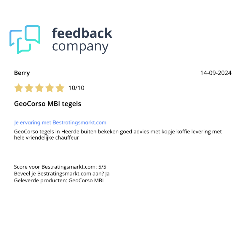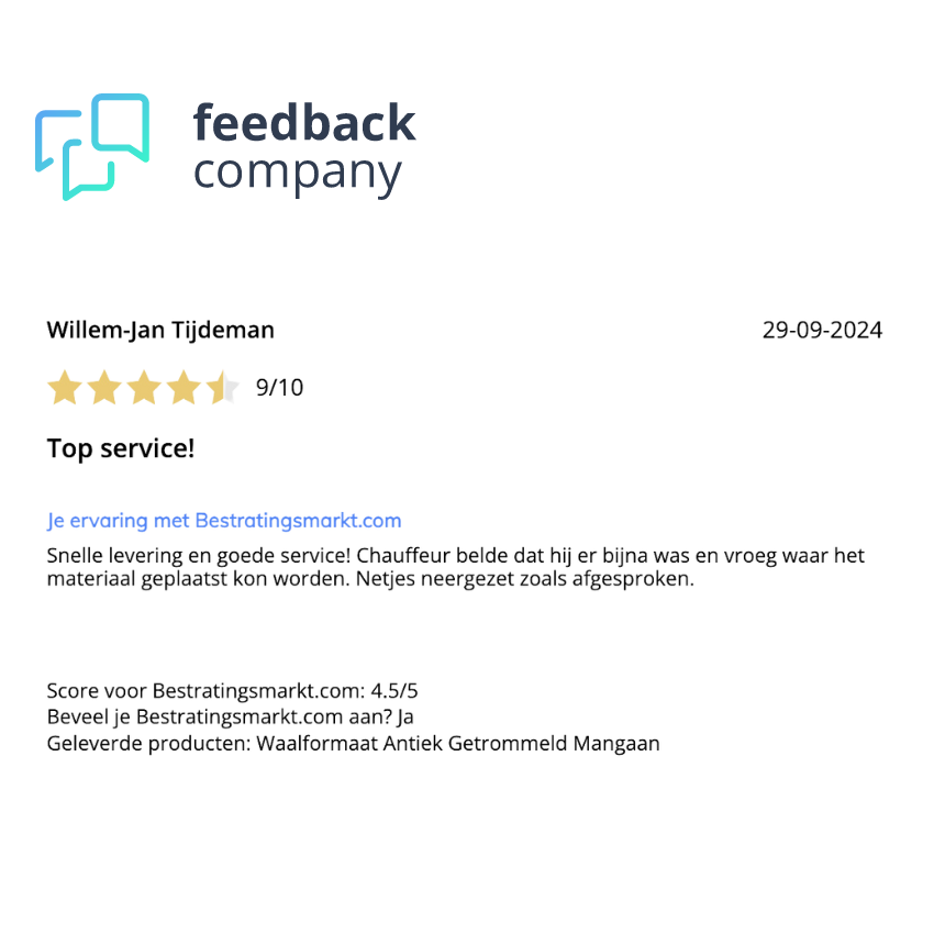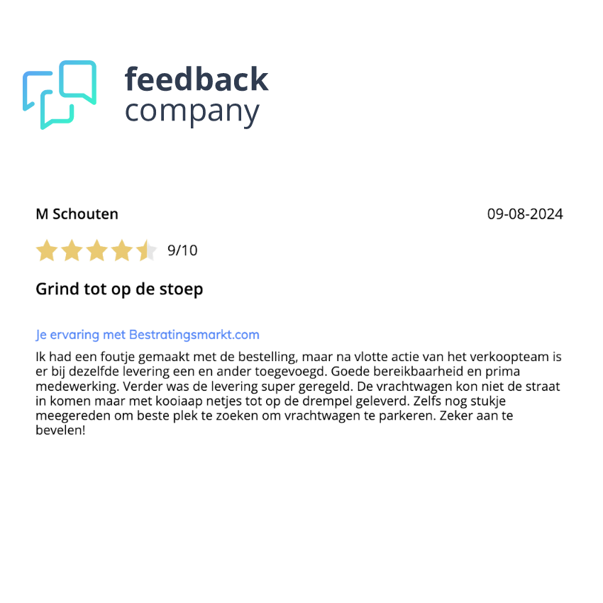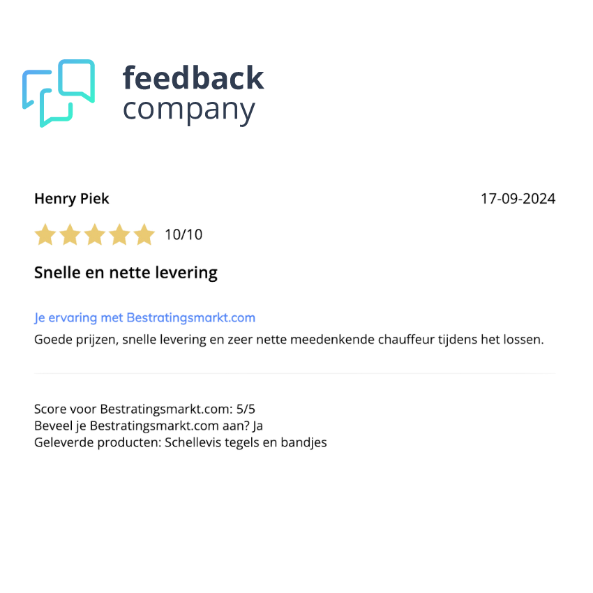 Lees gerust alle ervaringen met Sierbestratingsmarkt.com op de onafhankelijke pagina van The Feedback Company.